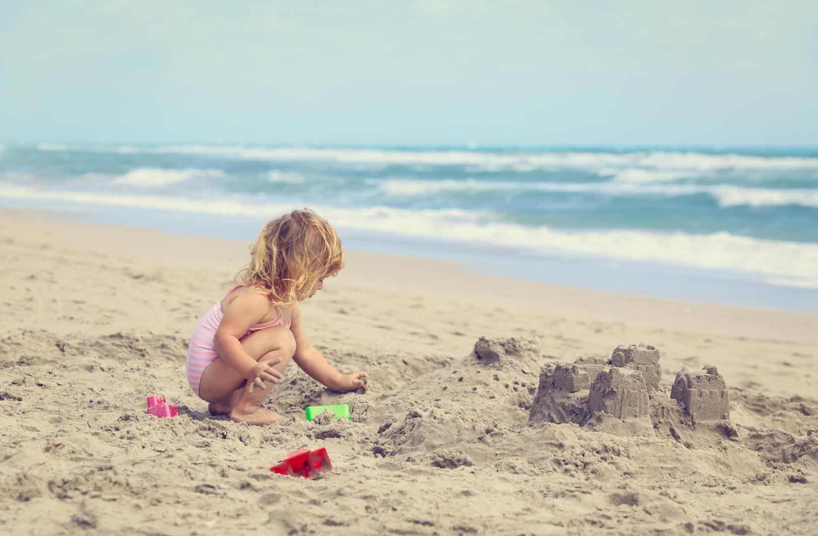 Little girl playing beach Peekaboo Ibiza baby equipment rental